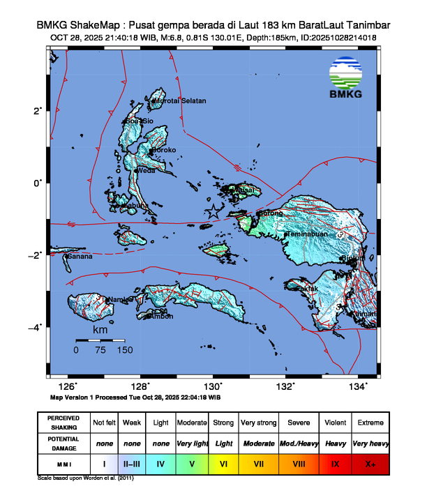 Dirasakan III Teluk Bintuni, III Sorong Selatan, III Raja Ampat, III Maybrat, III Kaimana, III Sorong, III Tepa, III Tual, IV Saumlaki, III Manokwari, II-III Fak-fak, II-III Dobo, II Nabire, II-III Dogiyai, II-III Deiyai, II Enarotali